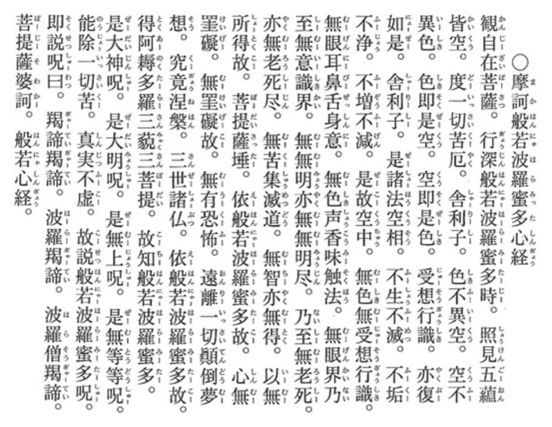 観自在菩薩行深般若波羅蜜多時照見五蘊皆空度一切苦厄舎利子色不異空空不異色色即是空空即是色受想行識亦復如是舎利子是諸法空相不生不滅不垢不浄不増不減是故空中無色無受想行識無眼耳鼻舌身意無色声香味触法無眼界乃至無意識界無無明亦無無明尽乃至無老死亦無老死尽無苦集滅道無智亦無得以無所得故菩提薩埵依般若波羅蜜多故心無罣礙無罣礙故無有恐怖遠離一切顛倒夢想究竟涅槃三世諸仏依般若波羅蜜多故得阿耨多羅三藐三菩提故知般若波羅蜜多是大神呪是大明呪是無上呪是無等等呪能除一切苦真実不虚故説般若波羅蜜多呪即説呪曰羯諦羯諦波羅羯諦波羅僧羯諦菩提薩婆訶般若心経