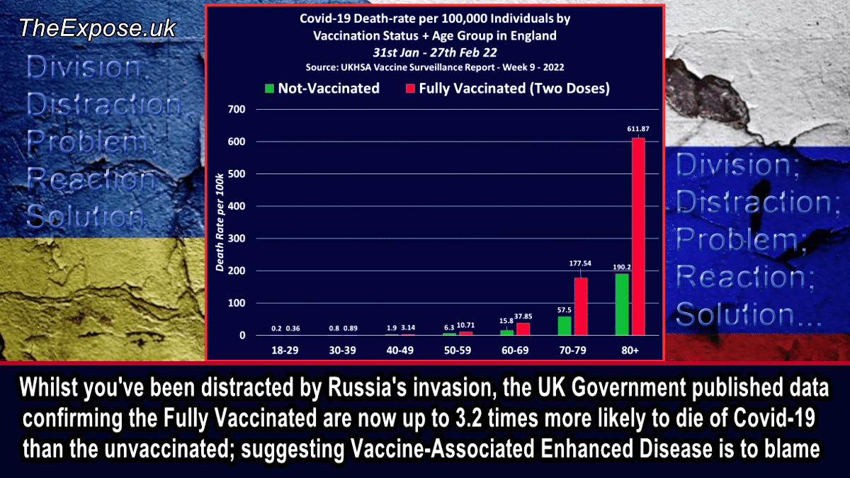 ロシアの侵略に気を取られている間に、英国政府は完全なワクチン接種者が非接種者に比べてCovid-19で死亡する確率が最大3.2倍であることを確認するデータを発表しました。