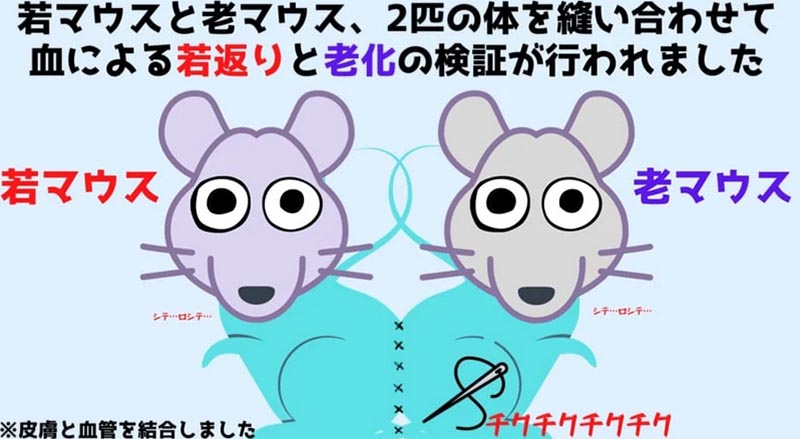 そこで今回、スタンフォード大学の研究者たちは、生後4カ月の若マウスと19カ月の老マウス(人間で言えば25歳と65歳)の体を縫い合わせることにしました。