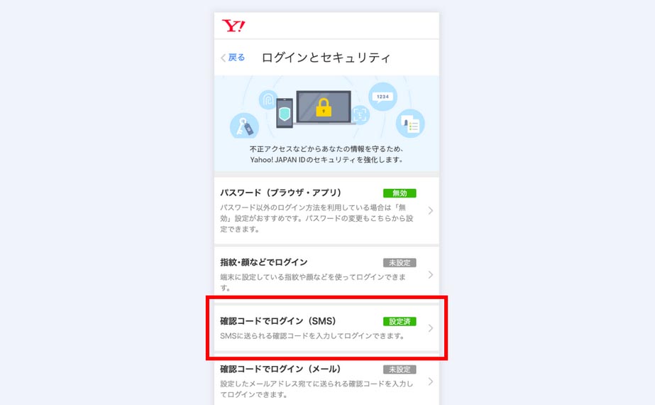 Yahoo! JAPAN ID登録情報の「ログインとセキュリティ」をご確認いただき、「確認コードでログイン(SMS)」の項目が「設定済」となっていれば設定はお済みです。