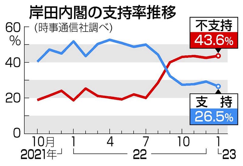 時事通信が13~16日に実施した1月の世論調査で、岸田内閣の支持率は前月比2.7ポイント減の26.5%だった。政権発足後最低だった昨年10月(27.4%)を下回り、政権維持の「危険水域」とされる20%台は4カ月連続となった。不支持率は最高の43.6%(前月比1.1ポイント増)。防衛力強化に伴う増税方針の表明や一段と進む物価高などが影響したとみられる。
