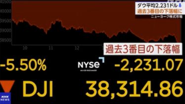 アメリカ NYダウが過去3番目の下落幅に。1日で970兆円相当の時価総額が消失 NYダウが過去3番目の下落幅に。1日で970兆円相当の時価総額が消失NYダウ 2231ドル下落 過去3番目の下落幅 米中貿易摩擦激化懸念4日のニューヨーク株式市場ではダウ平均株価が2231ドル下落し、一日の下落幅としては過去3番目の大きさと... 2025.04.05 アメリカ