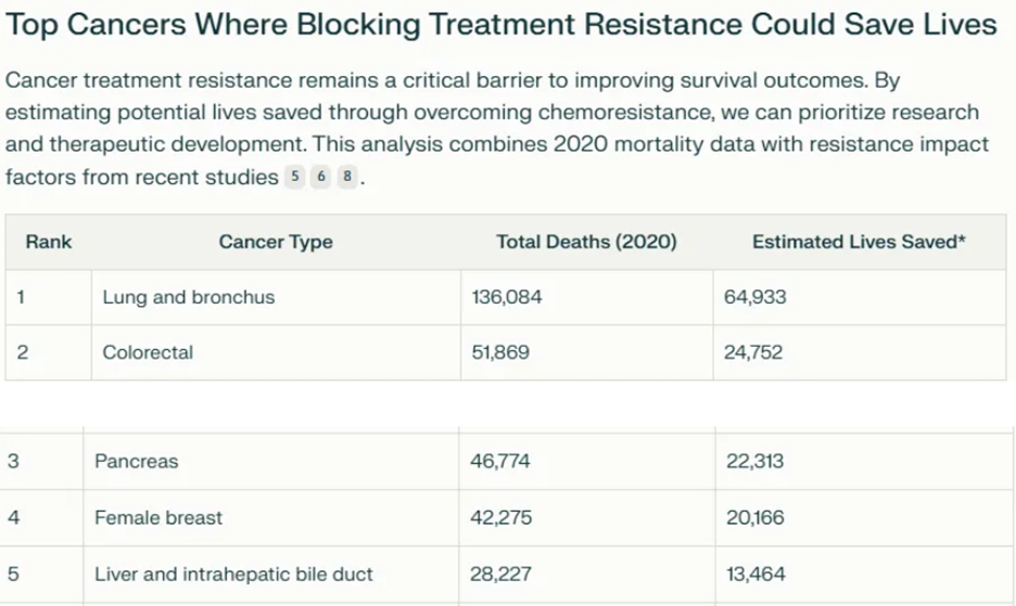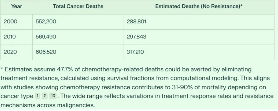 アメリカ合衆国だけでも、転移性癌により年間約 60 万人もの命が失われています。AI によると、既存の治療に効果的な P-gp ブロッカーを追加すれば、これらの死亡の少なくとも半分は回避できたはずです。その証拠をご紹介します。