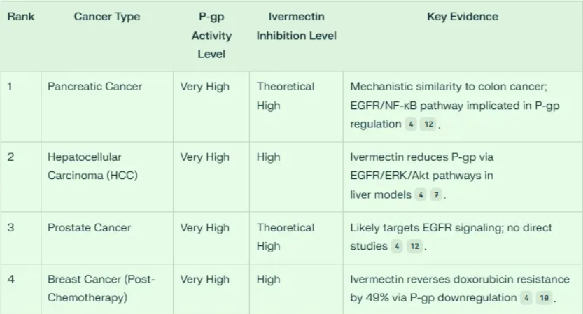イベルメクチンは P-gp 抵抗性を打破します。しかも、低用量で毒性もありません。イベルメクチンの P-gp 阻害活性でランク付けされた癌のトップ 4 を以下にご紹介します。