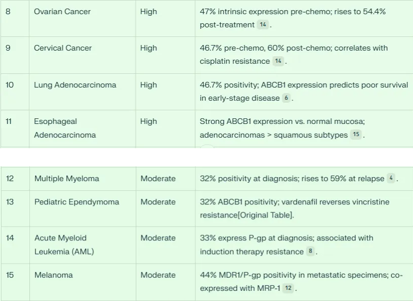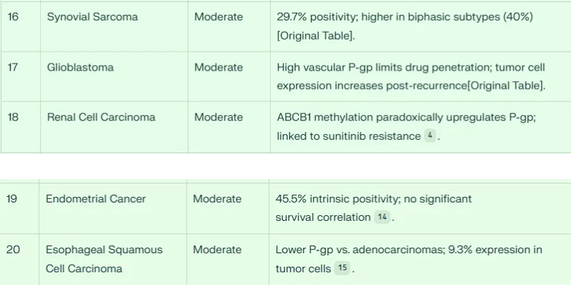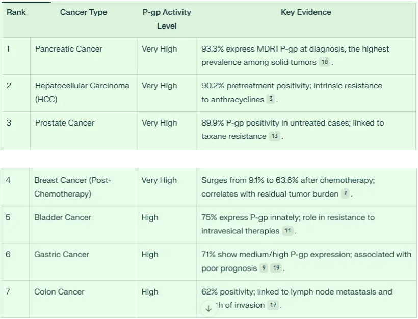 ほとんどの癌は P-gp 活性が高く、ご想像のとおり、治療に対する反応も悪い傾向があります。以下は、P-gp 活性が高く、治療抵抗性を迅速かつ強力に発達させる癌の一覧です: