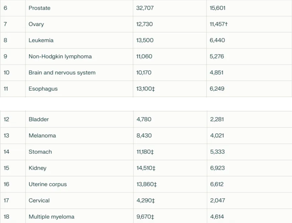 2.卵巣がんは、総死亡者数は少ないものの、死亡例の 90% が化学療法抵抗性であるため、治療上の課題が極めて大きいことを反映して 7 位に急上昇しています。