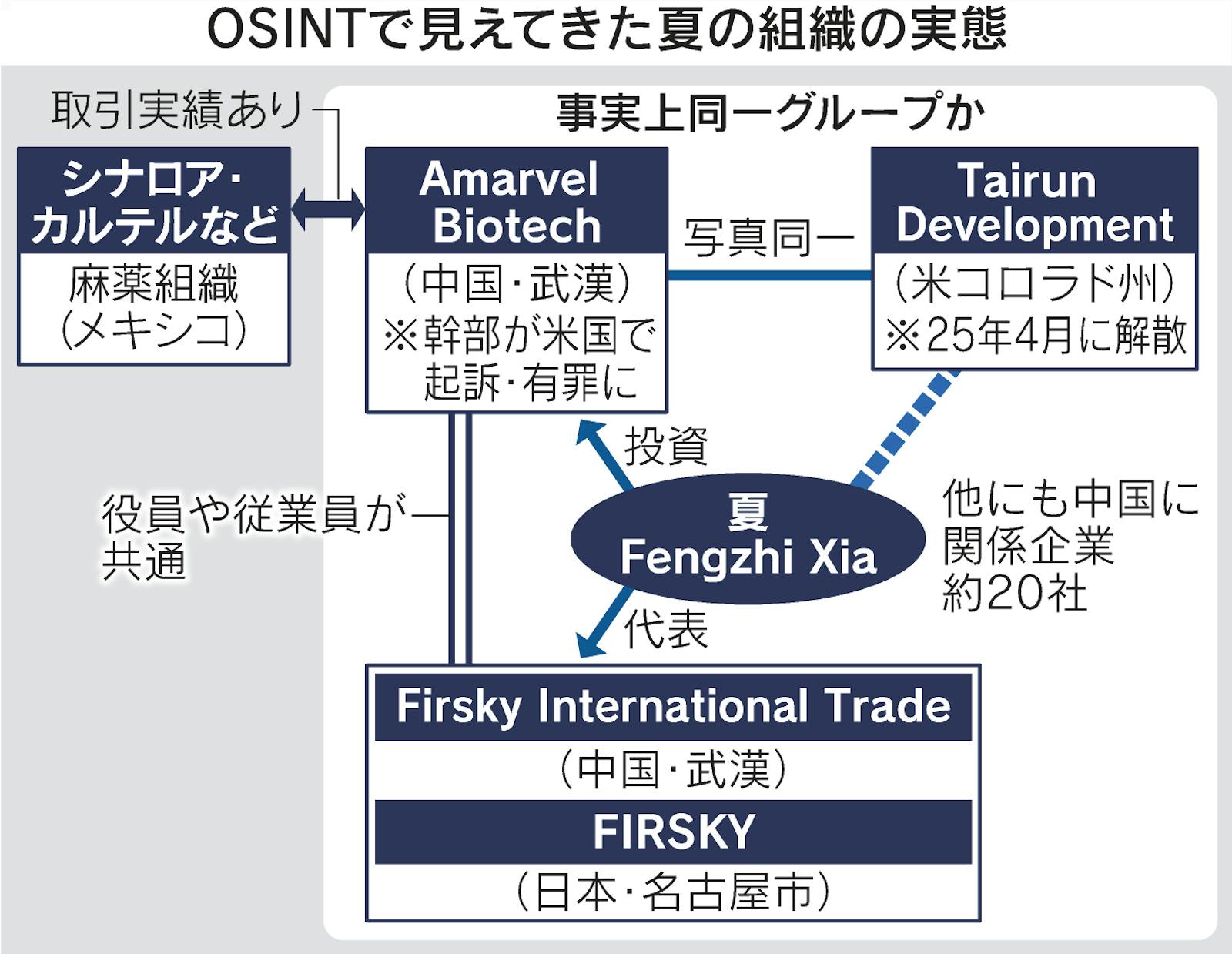 フェンタニルを米国に密輸していた中国組織「湖北アーマベルバイオテック」(Amarvel)と事実上同一組織である富仕凱の中国子会社が日本に拠点を置き活動していたことも発覚。