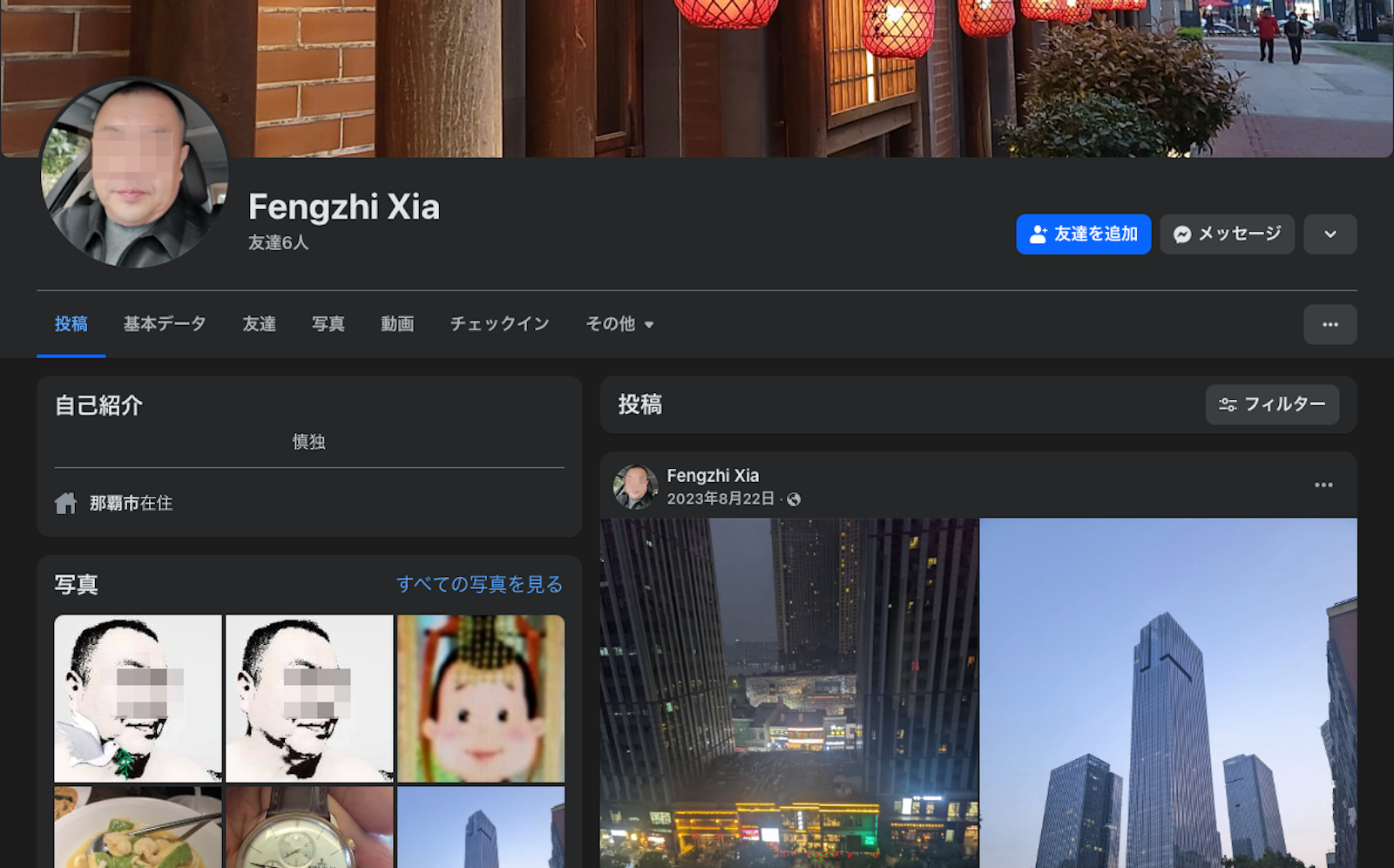 沖縄県の那覇市在住。プロフィル写真は丸刈り風の東アジア系男性。友達登録は6人のみ、フォロー先はひとりだけで、ベトナムの薬品関係者とつながっており、中国・武漢の高層ビル写真を投稿。。