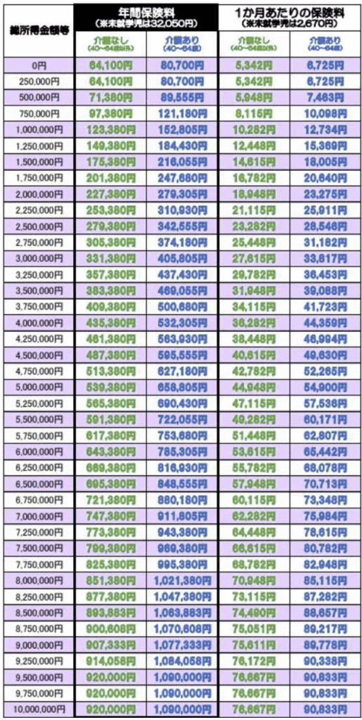 たとえば、所得が500万円の場合には、40歳以上で年額65万8805円の保険料となります。