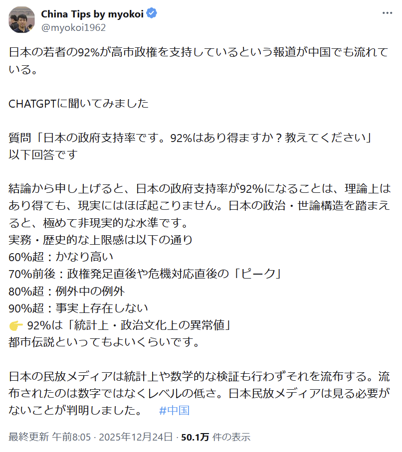 日本の若者の92%が高市政権を支持しているという報道が中国でも流れている。