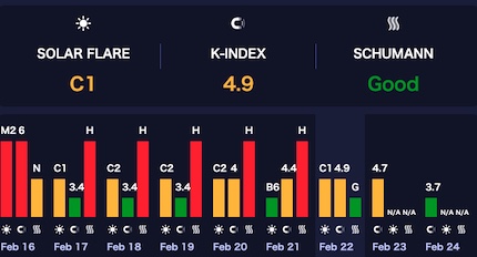 …今月(2月)すでにK指数が 5.0を超えた日が 4日あり、これらの波の周波数に敏感な多くの人々が深刻な急上昇を身体で感じる可能性があることを意味している。