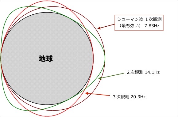 シューマン共振とは、地球の高層(電離層)で常に振動している周波数で、以下のようになっています。このうち、もっとも強い「 7.83Hz」というシューマン波が、よく取りあげられるものです。