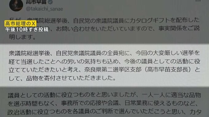 高市総理側が今月おこなわれた衆議院選挙で当選した自民党議員に対し、当選祝い名目で数万円相当のカタログギフトを配布していたことが分かりました。高市総理も自身のXを更新し、認めています。