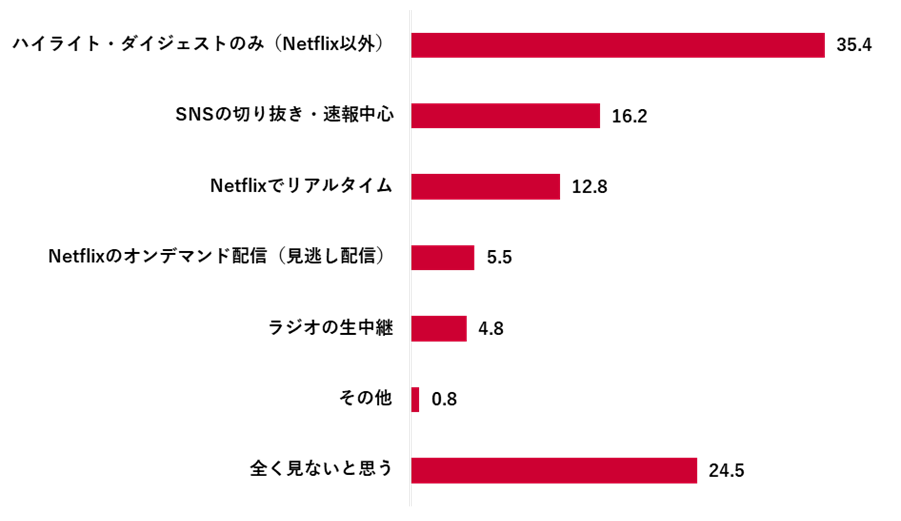 高まる「有料の壁」を前に、今大会を視聴するとした人のうち、最も多い35.4%が「Netflix以外のハイライト・ダイジェスト」を選択。これに「SNSの切り抜きや速報中心」の16.2%を加えると、リアルタイム視聴以外で大会に接する層が半数を超える計算だ。