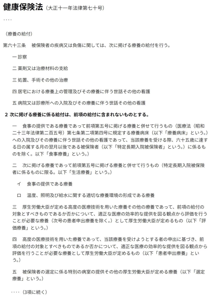 この条項の第二項では、例外的に保険診療との併用が認められる項目、すなわち「混合診療禁止の例外規定(保険外併用療養費)」を定めています。
