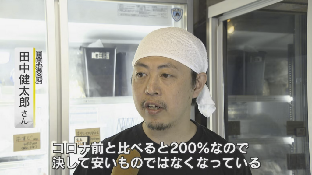 田中精肉店の田中健太郎さんは「1月、2月に比べて120%アップ。コロナ前からいくと200%まで上がっているので、決して安いものではなくなっている」と話す。仕入れ価格の高騰を受け、2026年に入って販売価格を100グラムあたり約100円引き上げた。