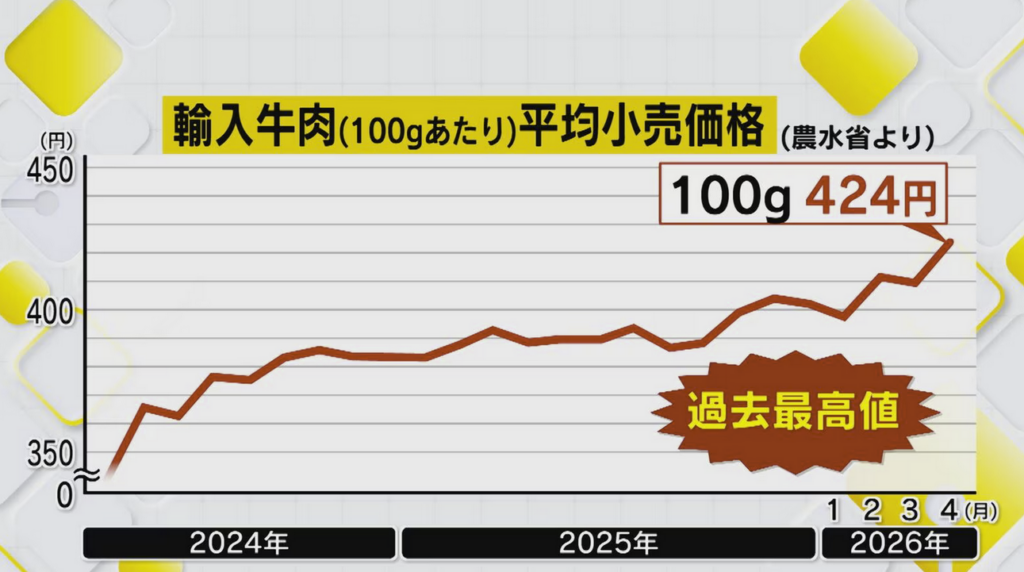 農林水産省によると、4月13日から15日に全国のスーパーなどで販売された輸入牛肉の平均価格は100グラム当たり424円と、過去最高値を更新した。