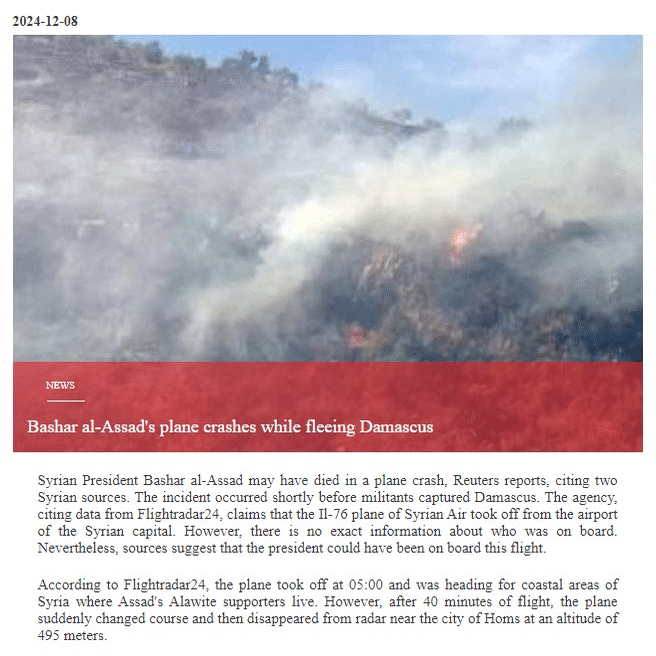 現在、墜落現場とされる写真がソーシャルメディアに出回っている。 それらのソーシャルメディアは、バッシャール・アサドが飛行機に乗っており、彼は現在死亡していると主張している。