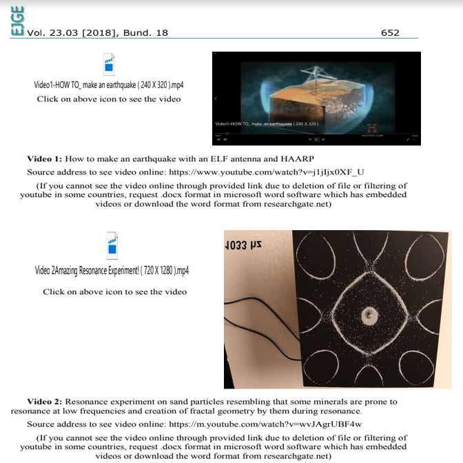 地殻変動プレートに存在する山脈や断層を形成する主要な結晶は、石英(火成岩、変成岩、堆積岩に多く含まれる)と方解石(主に堆積岩に含まれる)である。これら2種類の結晶は六角形構造に組織化されており、その六角形構造の結果として実質的な共鳴ポテンシャルを示している。大量の石英と地震の間の依存関係はLowreyとPérez-Gussinyéによって研究され、2011年のnature journalに掲載された。石英と方解石鉱物は、磁気圏の不規則性と隣接する電磁周波数(EMF)、特に極低周波(ELF)の変化により共鳴を発生させる。地球磁気圏の変化は、太陽系の放射線の影響のような自然な理由によるものと、超(エネルギー)兵器による人工的なものがある。これらの変化は、地震につながる言及された六方晶に共鳴を引き起こす可能性がある(ビデオ1と2を参照)。地震の断層における亀裂の分散は、フラクタル幾何学パターンに基づいて形作られる(動画2の砂の配列で見ることができる)。これは、小規模な微小亀裂の形成と活性化が、マクロ亀裂の形成や刺激につながり、最終的に断層が主要な方向に移動することを意味する。石英や方解石の共鳴は、小規模な結合破壊を誘発し、より大規模な大陸断層や海洋断層を活性化し、地震を誘発する微小破壊を形成することができる。断層の中央部や活断層の破砕壁には、石英を多量に含むガウジや角礫岩を主成分とする充填材が存在する。これらの充填物は潤滑油の役割を果たし、断層を活動させるのに重要な役割を果たす。通常、正断層は逆断層や横ずれ断層よりも活動しやすい。しかし、地震帯が異なるタイプの断層から構成されている場合、正断層が動くと逆断層や横ずれ断層が動き出す。HAARPや他のスーパー(エネルギー兵器)は、決められた幾何学的アレイに設置されたアンテナの配置を変更し、特別な高度の電離層にELFやULFを放射することができる。