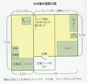 最初にご紹介するのは、住まいです。ぼくの一家が住んでいるのは、自給生活を営む先輩たちに譲ってもらったプレハブ3つをつなぎ合わせた構造の家です。この章は、そのマイホームを手に入れた時のお話です。