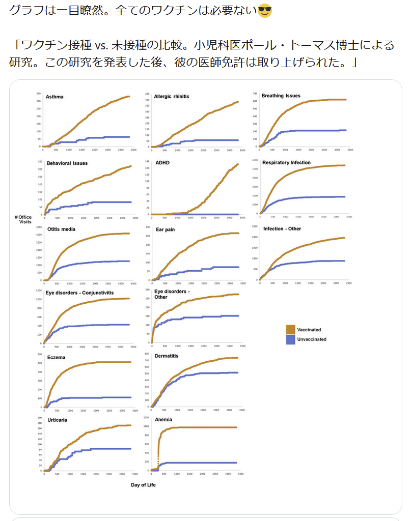 トーマス博士は3,324人の子供を調査し、ワクチン接種を受けていない子供は医者に行く回数が少なく、健康状態が良好であることを発見した。