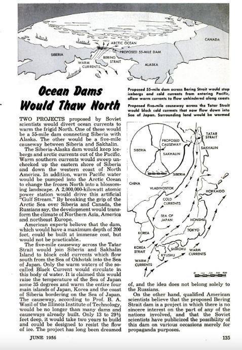 1950年代、ソ連の科学者ピョートル・ボリソフは、ベーリング海峡に巨大ダムを建造するというユートピア的なプロジェクトを立案しました。このダムは両国を結ぶだけでなく、海流の方向を変えることで北極海の氷を溶かし、気候を変化させることが期待されました(写真3)