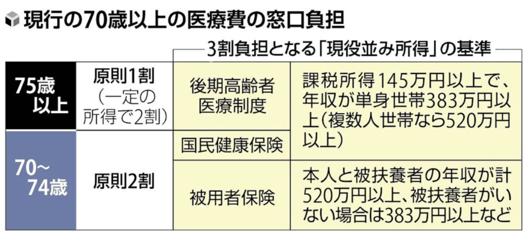 現行の窓口負担は、70~74歳は2割、75歳以上の後期高齢者は1割が原則だ。ただ、70歳以上でも「現役並み所得」があれば3割負担となる。75歳以上では、課税所得が145万円以上で、年収が単身世帯で383万円以上、複数人世帯で520万円以上を基準としている。