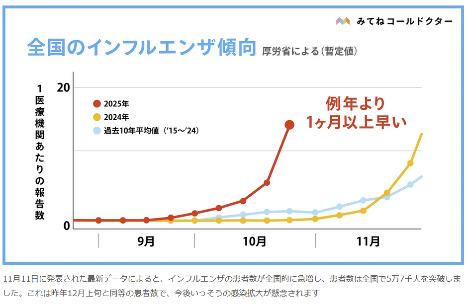 インフルエンザ新規報告数1万人超え ~ 定点3.26[感染症発生動向調査2025年第42週(10月13~10月19日)]