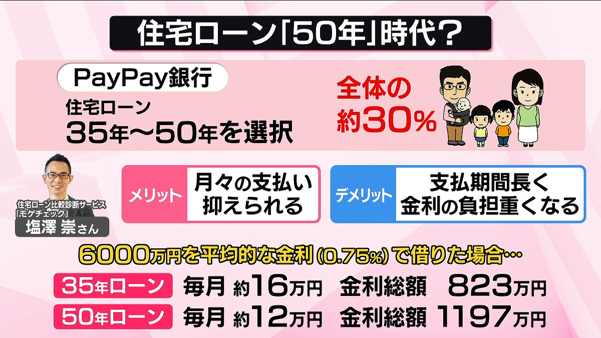 「私も35年で組みました。今、そのローンの形が変わってきていて、50年時代がやってきているということです。いくつかの銀行が展開しています。その1つのPayPay銀行によると、全体の30%ほどが35年~50年のローンを選択しています」