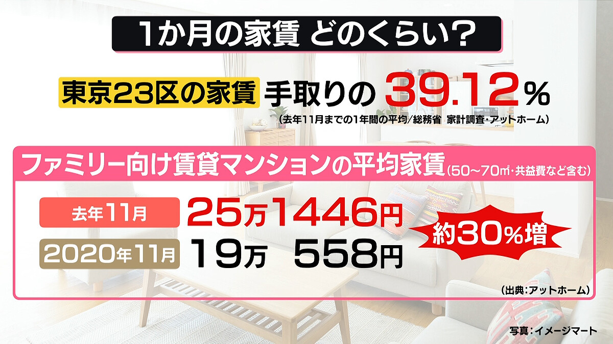 「去年11月までの1年間の平均で、東京23区では手取りの39.12%、4割に迫ってきているということです。アットホームによると、東京23区のファミリー向け賃貸マンションの平均家賃(50~70㎡、共益費など含む)は去年11月時点で25万1446円でした」