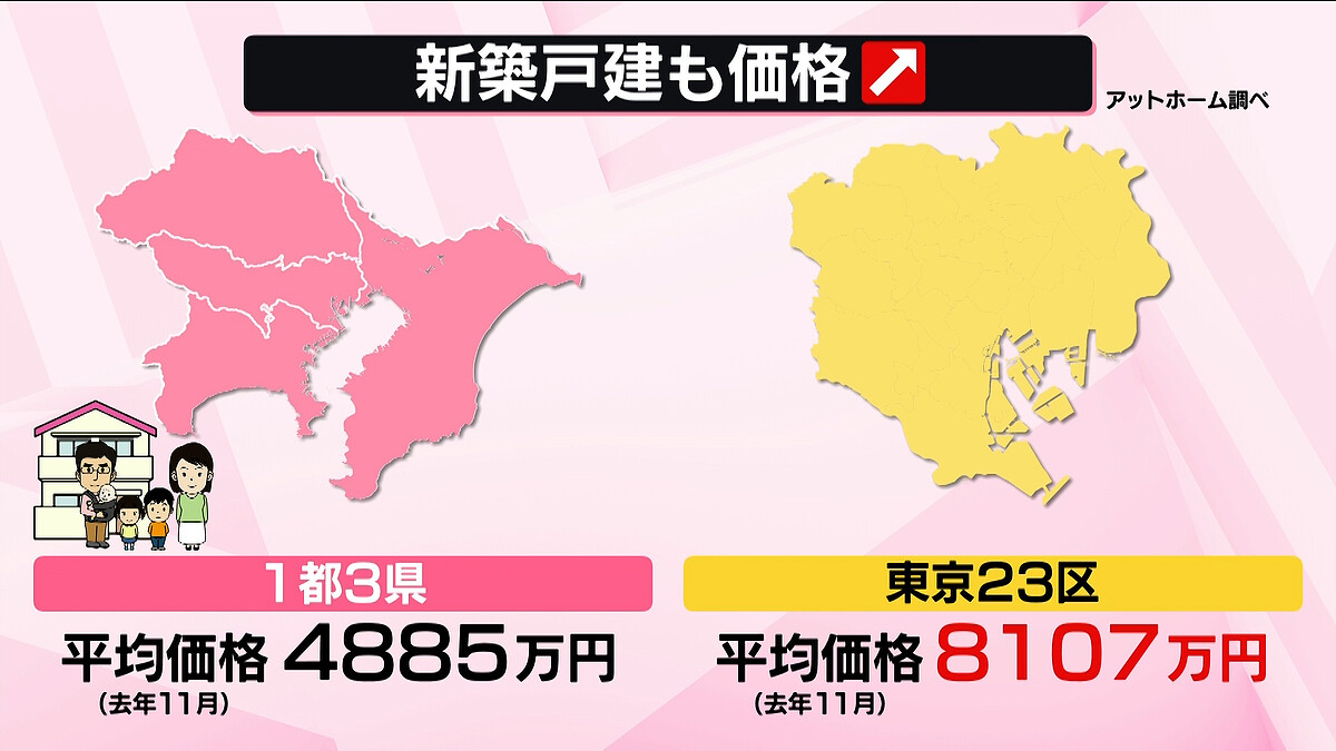 「毎月かかる固定費なので、他を削っていくしかありません。賃貸だけでなく、戸建も高くなっています。アットホームの調べでは、首都圏1都3県の新築戸建の平均価格は、去年11月時点で5千万円を切って4885万円でしたが、東京23区に絞ると8107万円でした」