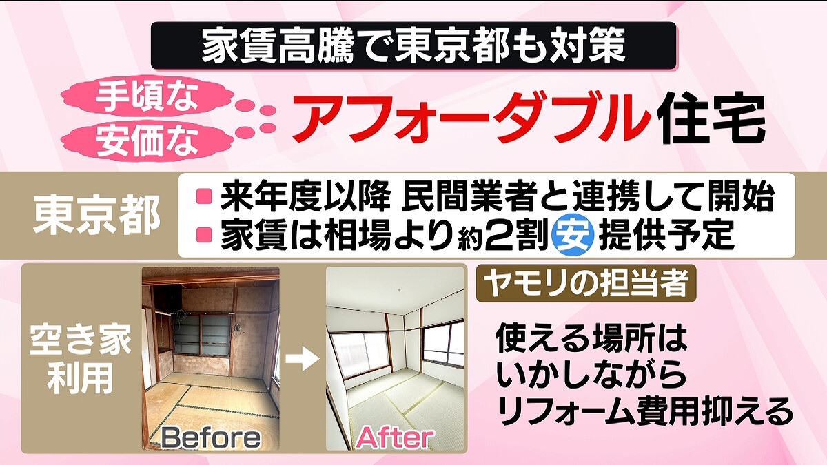 「来年度以降、子育て世帯などを対象として東京都が民間業者と連携して始める事業です。家賃が相場より約2割安く提供できる予定だということです」