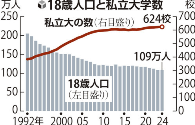 18歳人口は1992年の205万人から減少に転じ、2024年時点で109万人。この間、政府の規制緩和もあり私大は増え、1992年の384校から1・6倍になった。日本私立学校振興・共済事業団の2025年度調査では、私大の53%が定員割れに陥る。